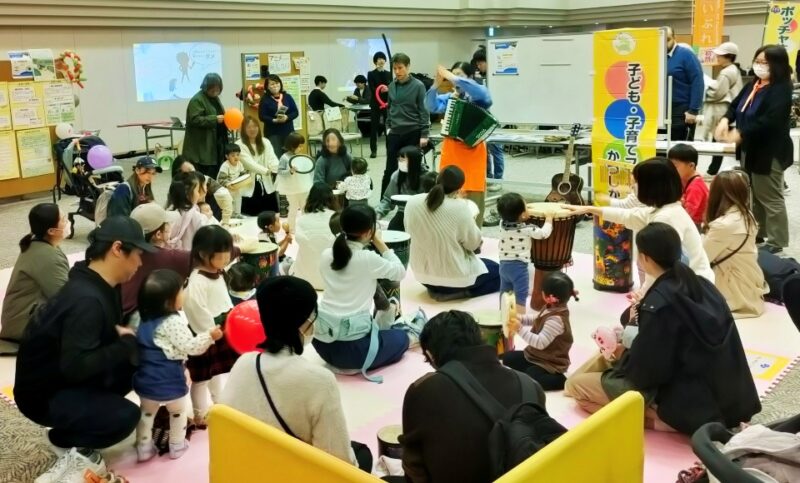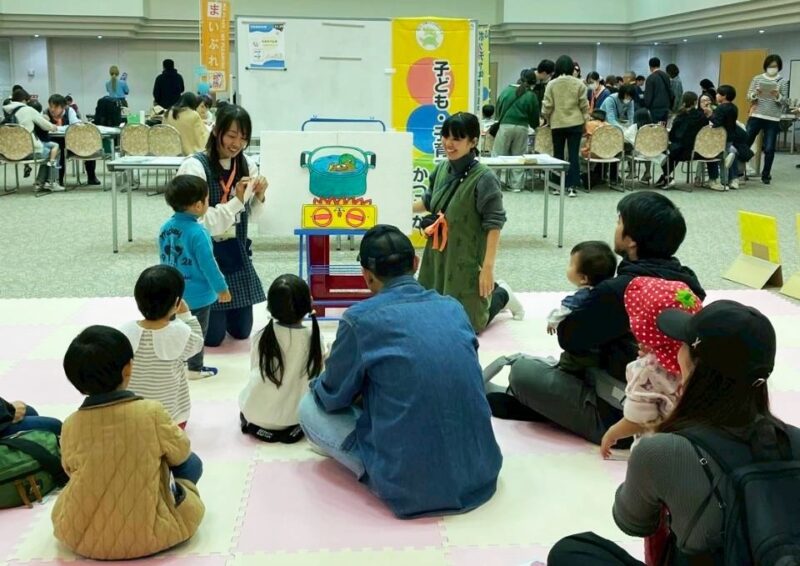 中央の乳幼児の広場では、30分ごとに音楽遊び、手遊びや紙芝居が変わりばんこに行われて、たくさんの子どもたちが楽しんでくれました~